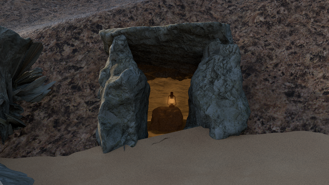 Une lampe à l'huile éclaire l'intérieur de la grotte. Le son, une sorte de sifflement haut-perché, vacille et vous intrigue autant qu'il vous effraie. Qui sait ce qui vous attend dans cette antre? Si vous décidez d'entrer dans la grotte, allez à la page
