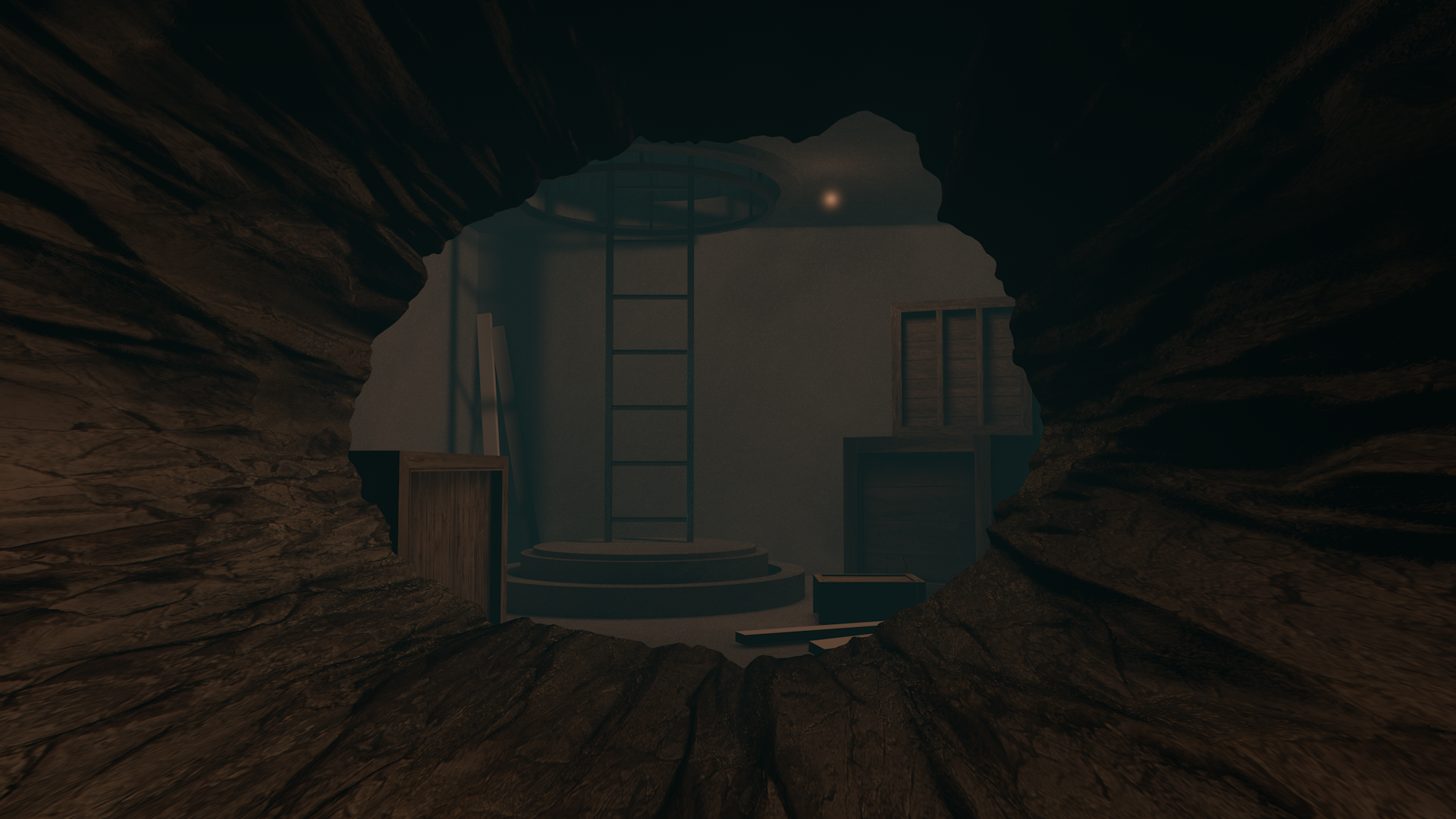 À votre grande surprise, la galerie donne sur une pièce bétonnée, tout à fait aménagée et remplie de caisses et de planches de bois. Plus intéressant encore, une longue échelle s'élève vers une cheminée ascendante. Vous vous avancez dans la pièce. Rendez-vous à la page