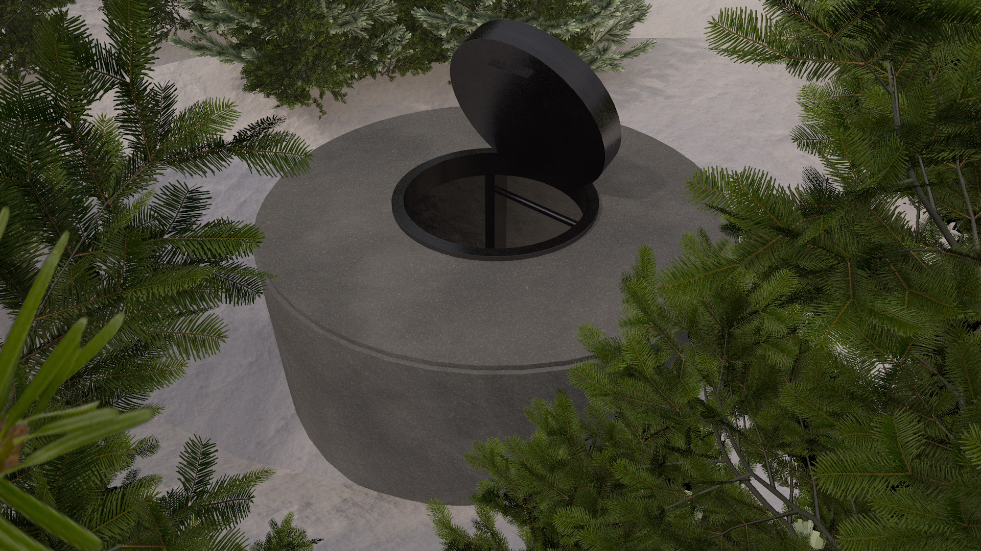 Poussant la trappe de toutes vos forces, vous vous hissez en dehors du puits. Vous constatez à votre grande stupéfaction que vous voilà rendu en pleine forêt, dans la neige, dans un décor très différent de ceux que vous avez traversé jusqu'à présent. Le vent souffle et vous examinez vos environs, à la recherche d'un indice sur le chemin à prendre. À gauche, vous distinguez au loin une route asphaltée. Rendez-vous y en page