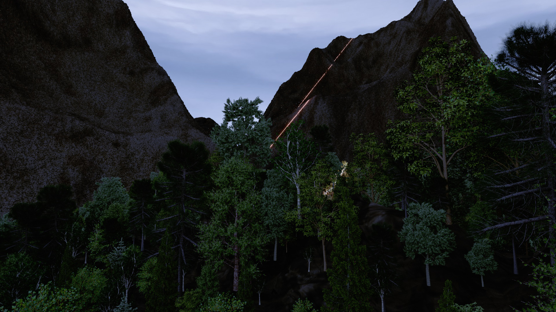 Avançant le long du sentier, au fond des bois, vous distinguez les hauts sommets de montagnes environnantes. Un trait de rouge traverse la face d'une d'entre-elle. Vous continuez à marcher, allez à la page