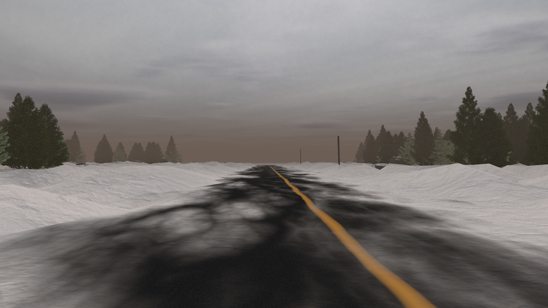 Le décor s'ouvre à vous alors que vous aboutissez sur cette route abandonnée, balayée par la neige rafalée. Continuez votre chemin vers l'est en page