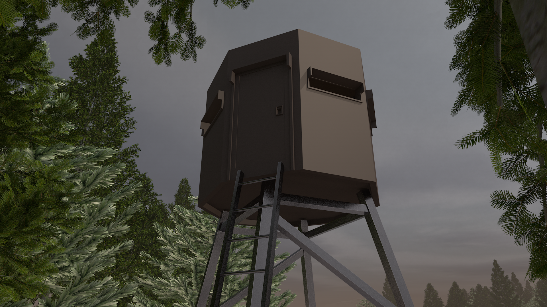 À l'arrière de la structure perchée, vous voyez une porte. Toujours pas de mouvement à l'intérieur de la tour, ni de bruit à proximité. Si vous tentez votre chance de vous mettre à l'abri en ouvrant la porte, allez à la page